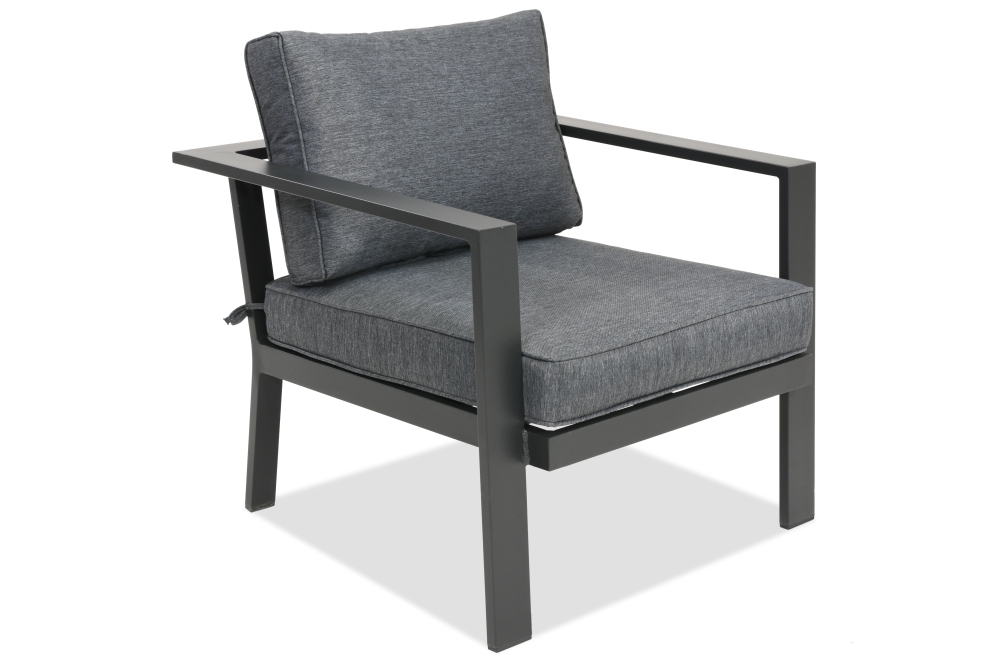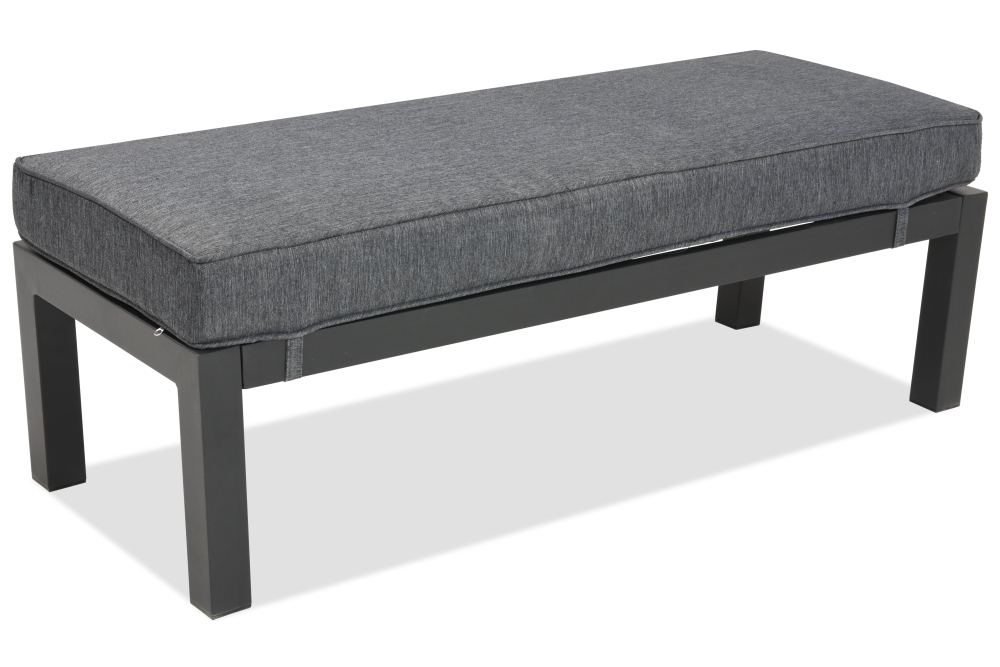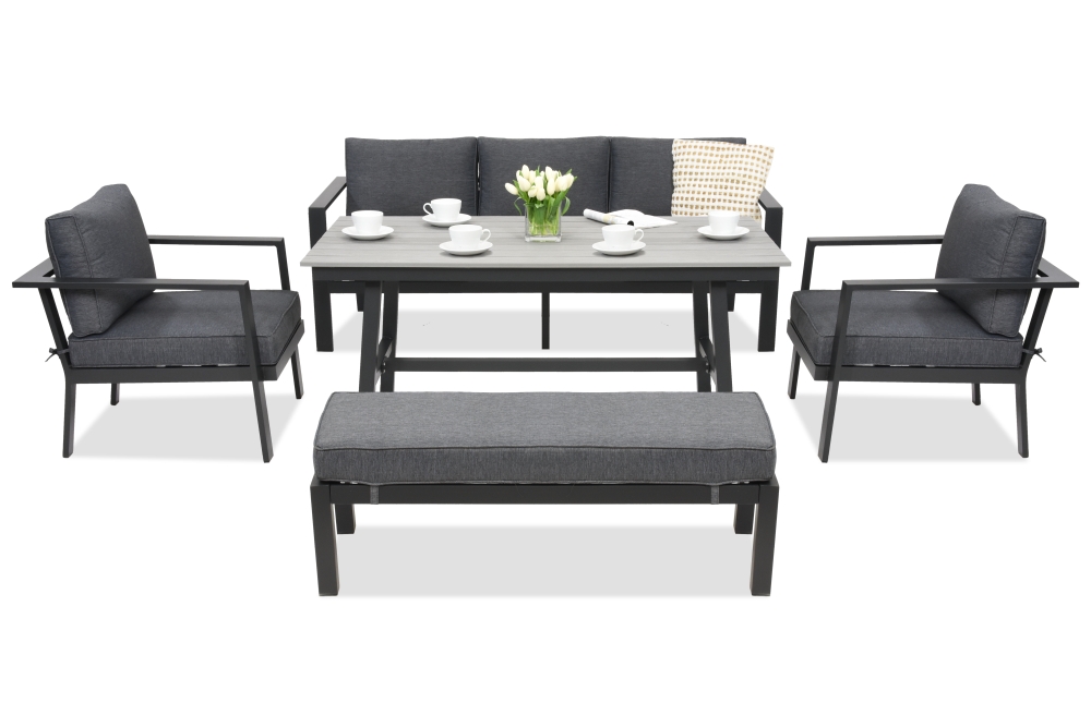 W komplecie mebli Sydney Apetito 5 marki Garden Point znajdują się nie tylko sofy i fotele, ale i dodatkowe miejsce do siedzenia w postaci ławki.
