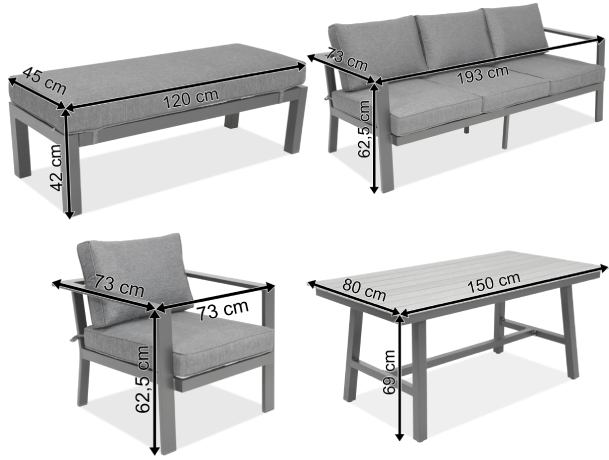 - Sofa trzyosobowa: 73 cm x 193 cm x 62,5 cm